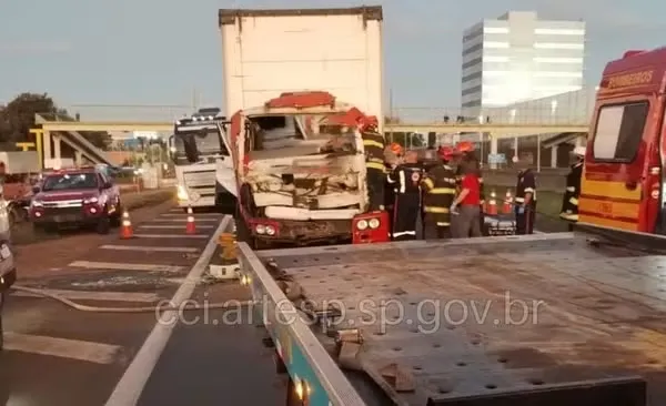 Acidente deixa caminhoneiro preso às ferragens e interdita a Rodovia Washington Luís